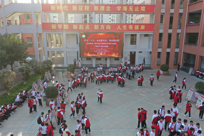2023年3月,学校组织全体学生观看中国共产党党史展板和党的二十大精神宣传展板