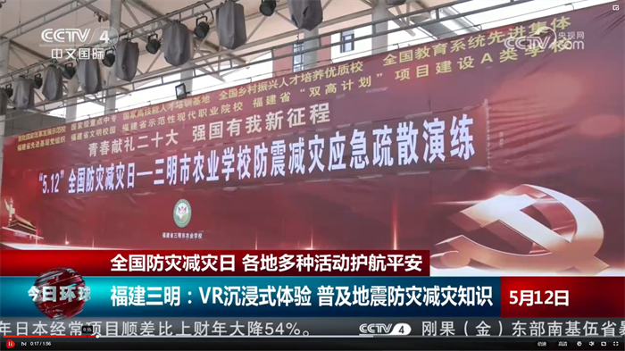 2023年5月,学校联合开展“5•12”全国防灾减灾日宣传教育示范活动被央视二套今日环球栏目报道